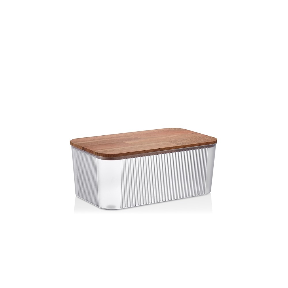 Porta pane in polistirene rigato trasparente con tappo in legno.