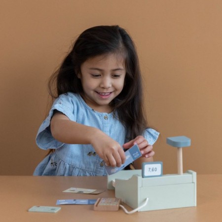Scansiona i prodotti e premi i piccoli pulsanti per presentare il totale. Preferisci pagare in contanti o con carta? Questo registratore di cassa in legno è dotato sia di un terminale a spillo che di monete e banconote da riporre nel cassetto contanti Tutto ciò che ti serve per giocare a fare shopping con mamma e papà, con gli amici o con la bambola preferita.