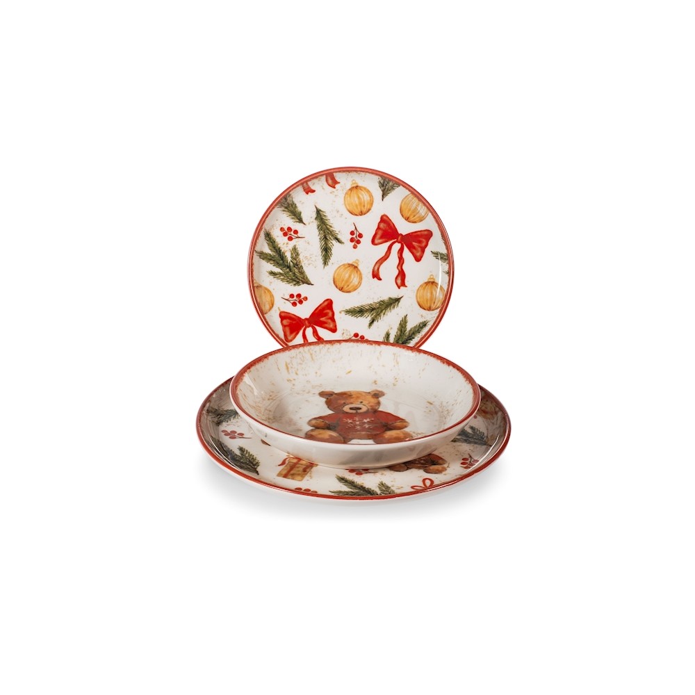 Regala un tocco di magia alla tua mise en place con il servizio tavola 18 pezzi Teddy in stoneware, decorato con l’iconico orsetto Teddy tra fiocchi, balocchi e rametti di pino. Caratterizzato da forma nordic, è composto da 6 piatti piani da 26 cm, 6 piatti fondi da 20,5 cm e 6 piatti frutta da 19,5 cm.